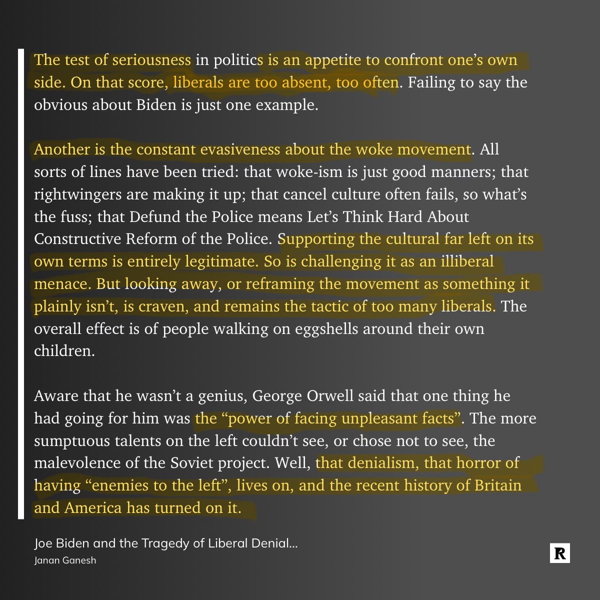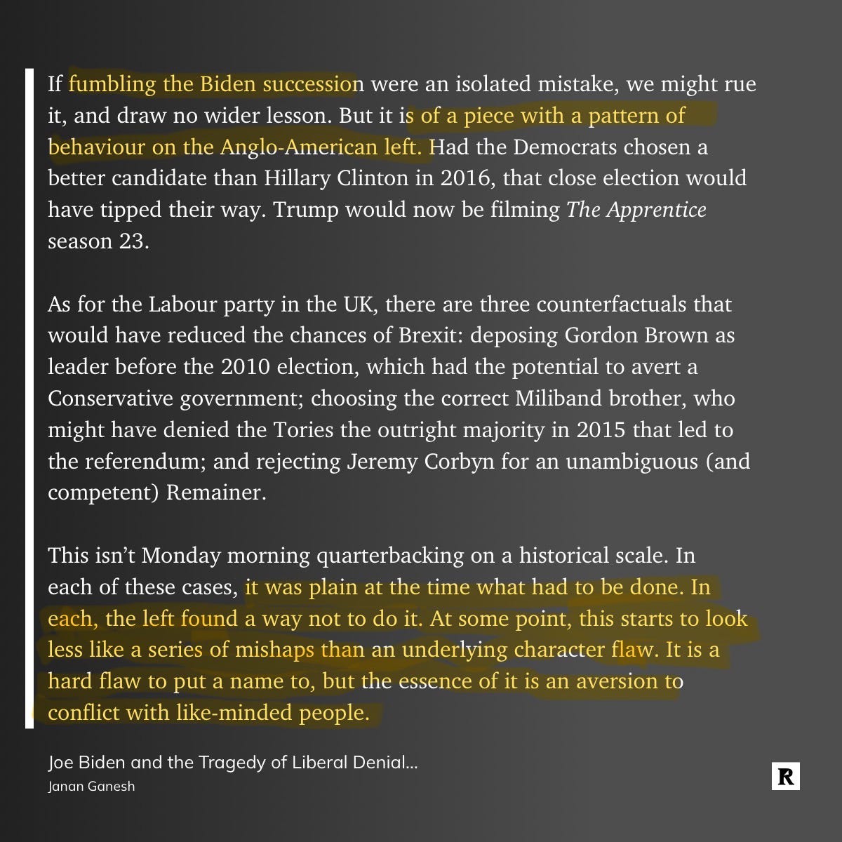 FT columnist Janan Ganesh finally put to words my biggest frustration with the US Democratic party, their pathological avoidance of conflict within their tribe. This essay does a great job flagging one of the biggest flaws of the left-leaning kumbaya jet-set. There seems to be a growing recognition that enough-is-enough, with popular book titles such as "The Courage to be Disliked", "The Art of Saying No" and "Woke, Inc.", but it might take a Republican win of the next US election before "leaders" of left-leaning parties in the G7 get the memo, or are ousted. Check out these excerpts: